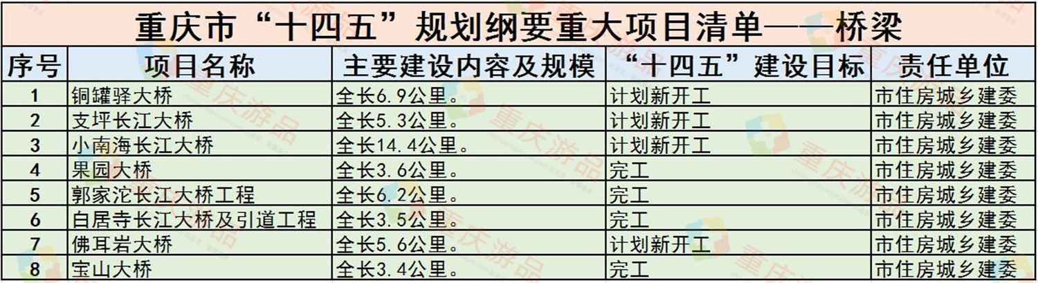 在这份重大项目清单中,一共涉及到的桥梁有8座,分别是铜罐驿大桥、支坪长江大桥、小南海长江大桥、果园大桥、郭家沱长江大桥工程、白居寺长江大桥及引道工程、佛耳岩大桥、宝山大桥。