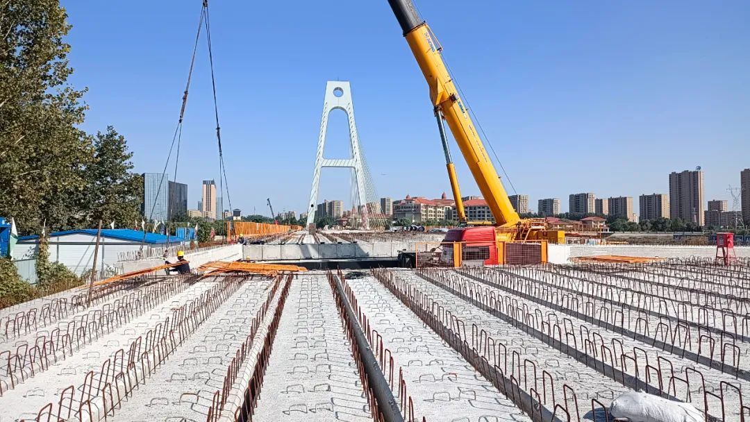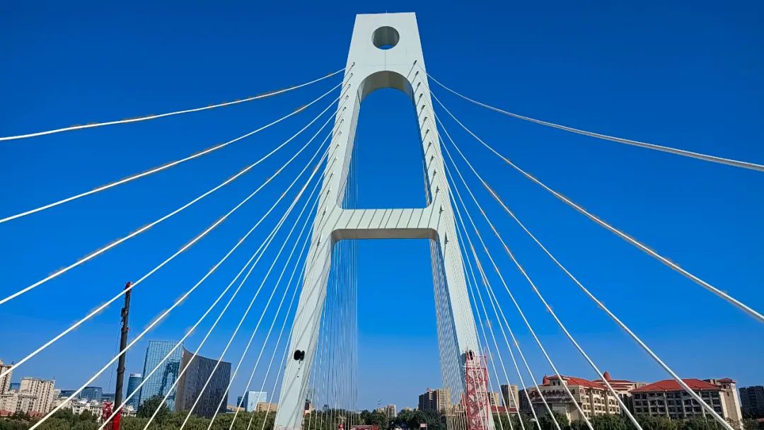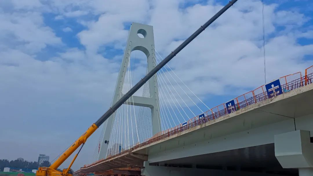 目前,桥面以下工程全部完成,主桥及引桥现浇梁、预制梁全部完成,A字型钢结构主塔已安装完成,正在进行引桥预制梁安装、铺装层施工,主塔拉索安装、钢结构细部处理,东侧坡道等工序施工,大桥预计2022年6月份建成通车。