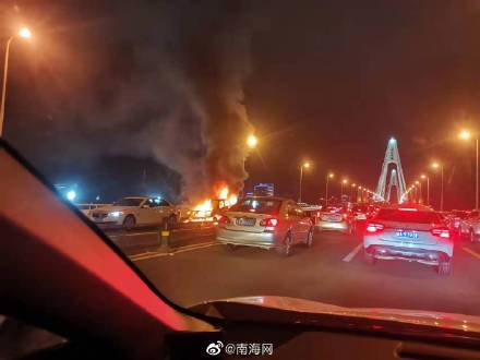 11月23日18时30分左右,在海口市世纪大桥北往南方向发生四车追尾事故后致最后一辆车着火。21时许, 记者从现场了解到, 着火的是一辆白色的凯迪拉克越野车,凯迪拉克追尾的前车是宝马轿车,宝马车里有2人,其中一名是孕妇已前往医院检查。目前,海口公安交警正在进一步调查该起事故原因。
