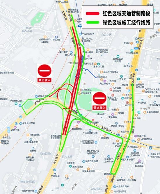 12月4日的23点至次日6点,对三桥立交桥(贵遵路往返改茶大道主线桥及上行匝道)实施临时交通管制,禁止车辆通行。由白云区、观山湖区往返三桥片区的车辆请由西二环通行;由贵遵路前往改茶大道的车辆请由三桥综合批发市场下匝道经三桥南路绕行;由改茶大道前往百花大道的车辆请由西二环、中坝路、三桥南路绕行。