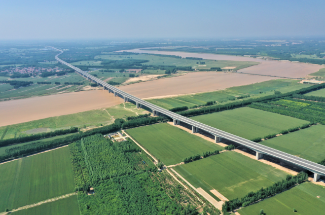 黄河特大桥位于山东省梁山县和河南省台前县境内,东接宁梁高速,西连台辉高速,是连接豫鲁两省的交通咽喉要道。桥梁如长虹卧波,横跨黄河,是“母亲河”上最长高速公路特大桥,全长11.42km,造价21.16亿元,双向六车道,由主桥、副桥、跨大堤桥、引桥共计56联组成。2016年9月开工建设,2019年12月竣工通车,前后历时3年,共投入4200余人,1200余台机械设备到项目建设之中。