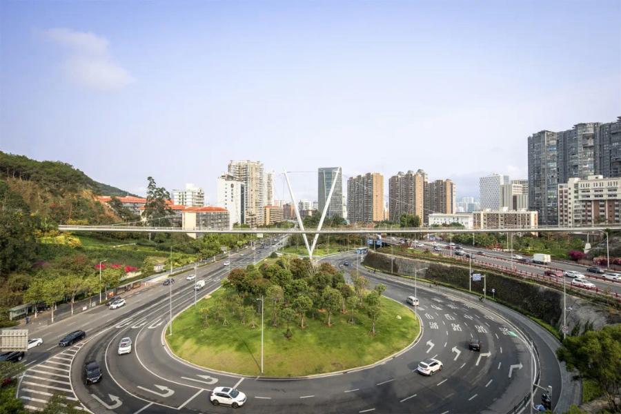 和美桥为厦门山海健康步道云海线七座特色节点桥梁之一,串联狐尾山及仙岳山山体步道,跨越仙岳路及海沧大桥引桥。50米高的V形桥塔伫立于仙岳路中央,连同有序排列的吊索、弯曲有度的梁体,仿佛张开双臂,热情拥抱着过往的行人,欢迎远方的宾客,在鹭岛西门户形成了一个引人注目的地标。
